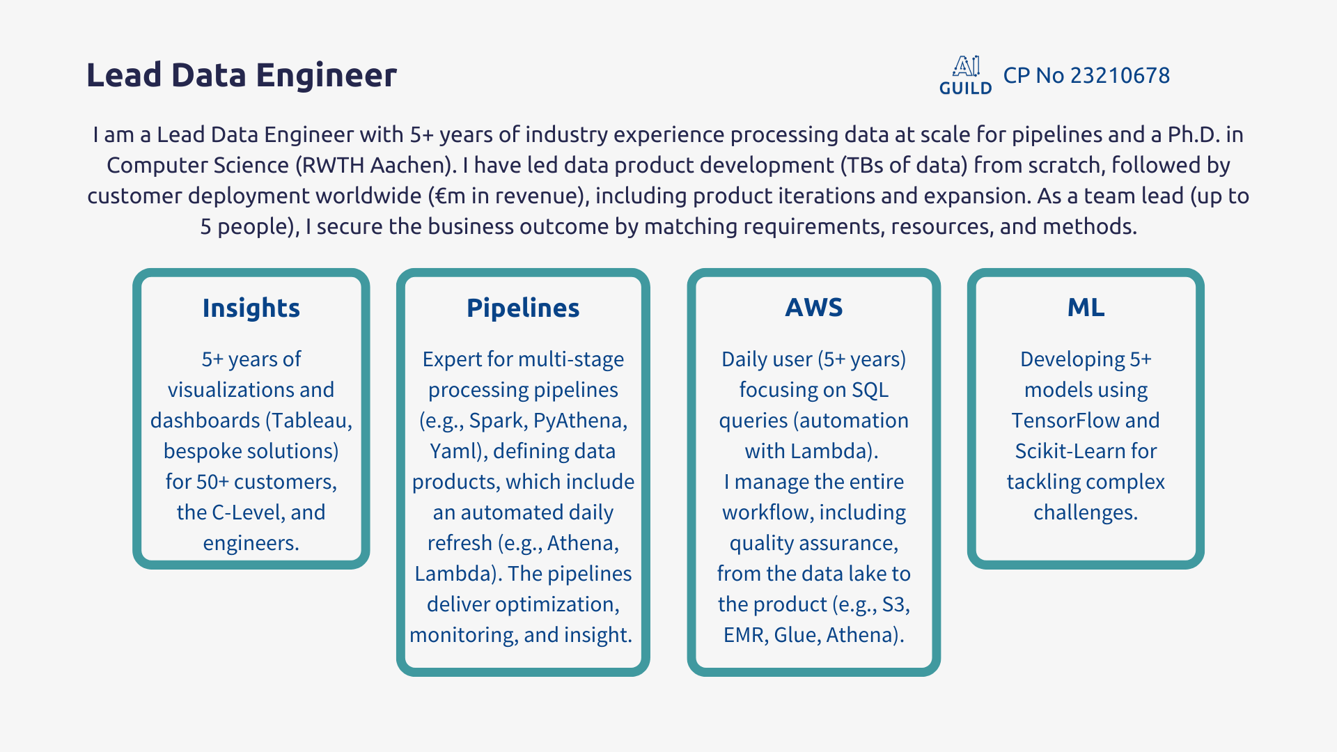 AI Guild members are experts and leaders in Data & AI, e.g., Analytics Engineering, Business Intelligence, Computer Vision, Data Analytics, Data Engineering, Data Science, Deep Learning, Machine Learning, MLOps, NLP, and Prompt Engineering.