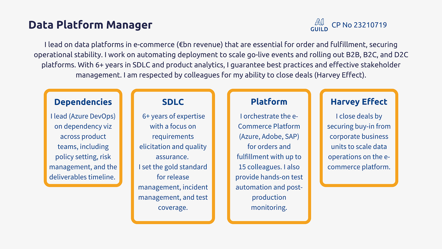 While data drives a platform, the expertise needed to manage it effectively is of a different kind, focusing on meeting business goals, managing deployment, and supporting the team. As a result, she has gained the deep expertise required as a Senior Platform Manager, including leading cross-functional teams.
